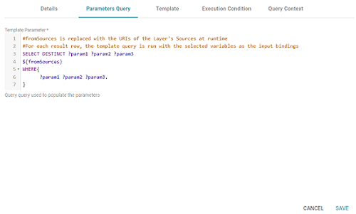 - When you have finished configuring the Details tab, click the Parameters Query tab. This tab defines the query to use for determining the key-value pairs for the Source that was selected on the Details tab. The tab provides a template for writing a SPARQL SELECT DISTINCT query. Edit the template as needed.