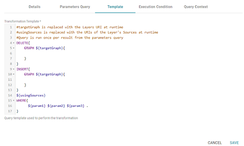 - When you have finished configuring the Parameters Query tab, click the Template tab. This tab contains the query to run for each of the key-value pairs identified by the Parameters Query. The template includes the syntax for writing SPARQL DELETE and INSERT queries and includes source and target graph parameters as well as the placeholder parameters from the Parameters Query.