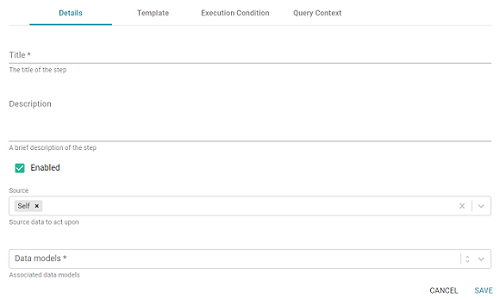 Once the Details tab is configured and the template and key-value pairs are defined, the step can be run. For information about running this step conditionally by setting up an execution condition, see Defining Execution Conditions.