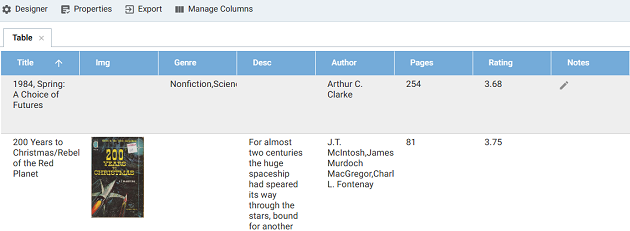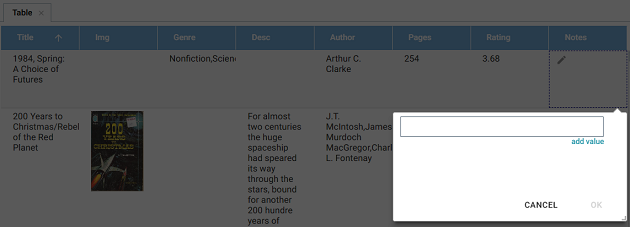 9. When you are finished setting any constraints, click Close and then click Save in the Designer. The lens is now configured to display the editable field. Hovering over a row in the table shows an edit icon () in the field. For example:
