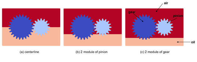 The numerical setup of the cases reflects the experiments geometrically and parametrically. All simulations were multi-phase. The viscosity of oil was set to be 0.057728 Pa*s and the density was set to 902 kg/m3 (The Castrol Syntrans 75W-85), with respective oil levels and tangential velocities applied. The air phase had the viscosity of 1.84e-5 Pa*s and density was set to 1.2041 kg/ m3.