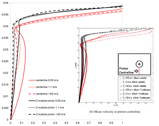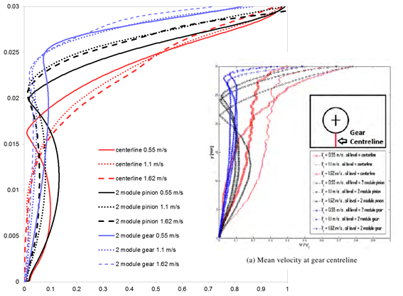 What can also be noticed is that in the experiments the centerline oil level results do not have any kinks, implying that for this oil level there is no recirculation beneath the gear. However, in the simulation, you see that there is recirculation for the case with 0.55 m/s. The runs with 1.1 and 1.62 m/s show no recirculation, but are relatively similar in profile, unlike in the experiments. Simulation velocity results exhibit a smooth transitioning trend going from the most shallow oil level (two module of the gear) to medium oil level (two module of pinion) to the highest oil level (centerline). There is a natural evolution of the velocity profiles as the oil level and velocities change. However, such behavior can only partially be observed in the experimental results for the two lower oil levels, but the centerline oil level velocity profiles clearly differ from the velocity curves of other two oil levels.