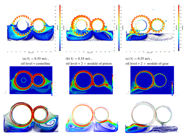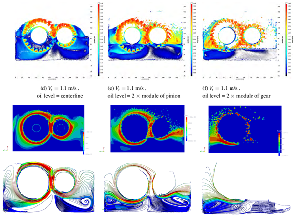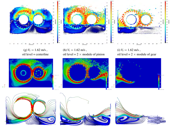 Figure 4 shows comparison of experimental and nanoFluidX results for Vt = 1.62 m/s cases, for all three oil levels. The agreement between the experiments and the simulation still remains high. The recirculation region beneath the gear in the centerline at Vt = 1.62 m/s is gone, matching the experimental results.