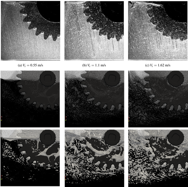 All three types of bubbles increase their presence with increasing Vt, as is to be expected. While exact quantitative comparison of the results is very difficult to make, it can be clearly concluded that the simulations qualitatively follow the experimental results and show essentially all three sizes of the bubbles (small, single particle, medium, few to a dozen particles in a group and large, bubbles occurring between the gear teeth). Trend of increasing aeration of oil with increasing velocity is also observed in the simulations. These results indicate that with some additional development in the code, it would be possible to predict foaming of oil.