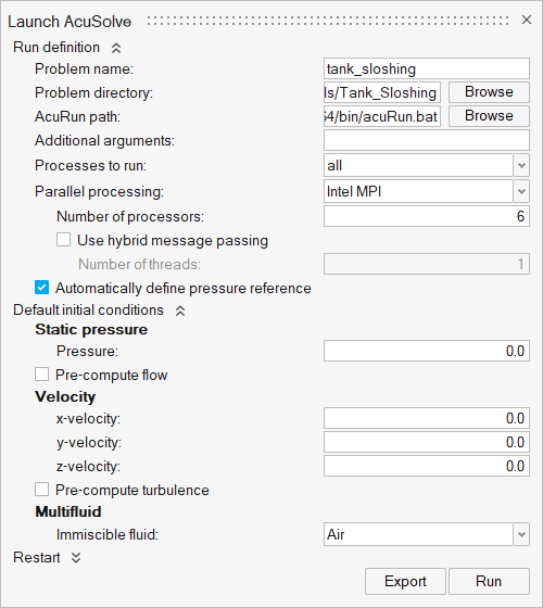 The Run Status dialog opens. Once the run is complete, the status is updated and you can close the dialog.Tip: While AcuSolve is running, right-click the AcuSolve job in the Run Status dialog and select View Log File to monitor the solution process.