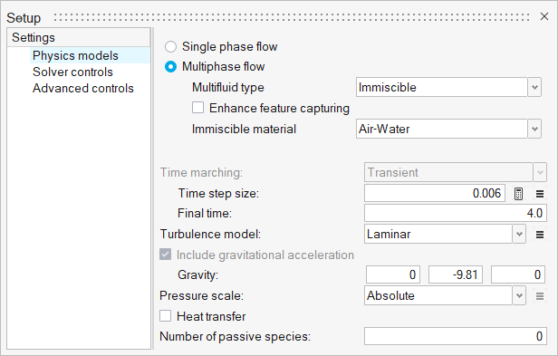 - Set the Multifluid type to Immiscible and the Immiscible material to Air-Water.