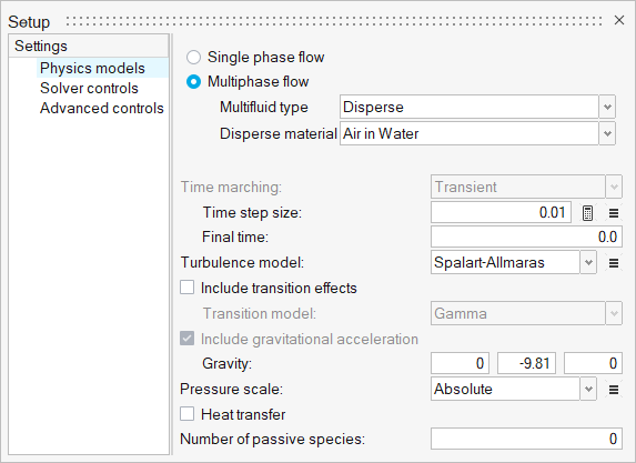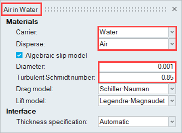 - Set the Multifluid type to Disperse and the Disperse material to Air in Water