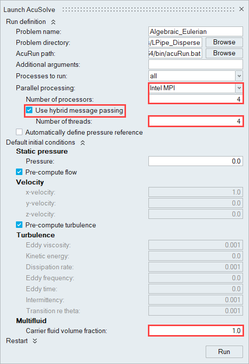 - Check the box for Use hybrid message passing and set the number of threads to the same as the number of processors.
