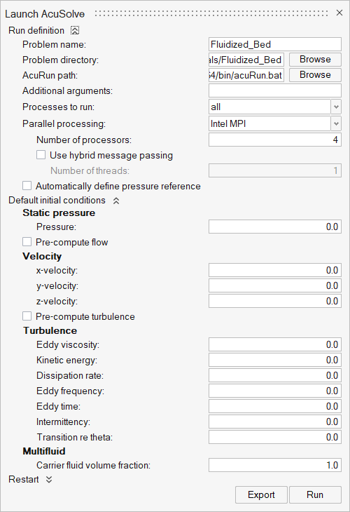 This tutorial provides the instructions for setting up and running a gas-solid fluidized bed simulation using the granular multiphase model. Prior to starting this tutorial, you should have already run through the introductory tutorial, ACU-T: 1000 Basic Flow Set Up, and have a basic understanding of HyperMesh CFD and AcuSolve. To run this simulation, you will need access to a licensed version of HyperMesh CFD and AcuSolve.