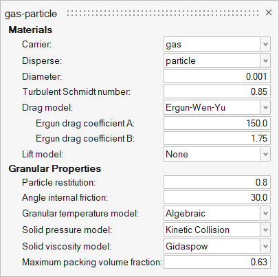 - In the Setup dialog, set the Granular Material to gas-particle.