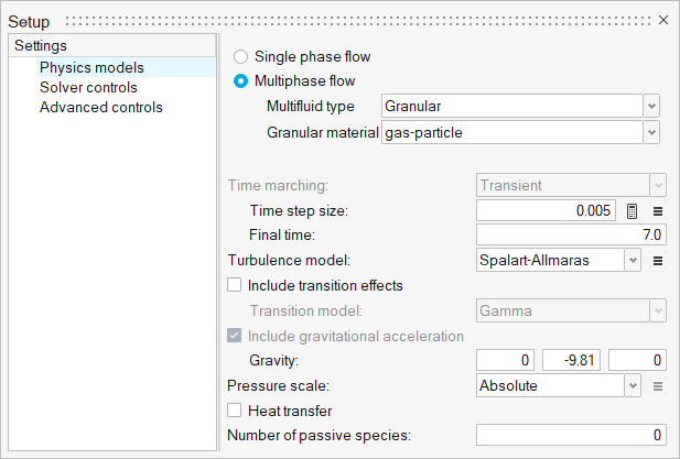 - Set Time step size and Final time to 0.005 and 7, respectively. Select Spalart-Allmaras for the Turbulence model.