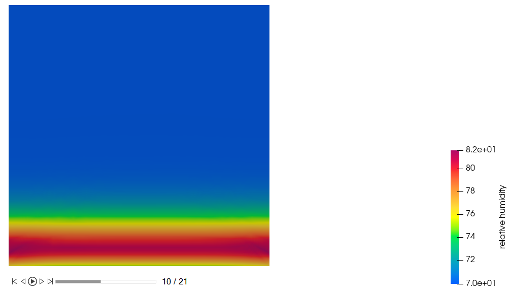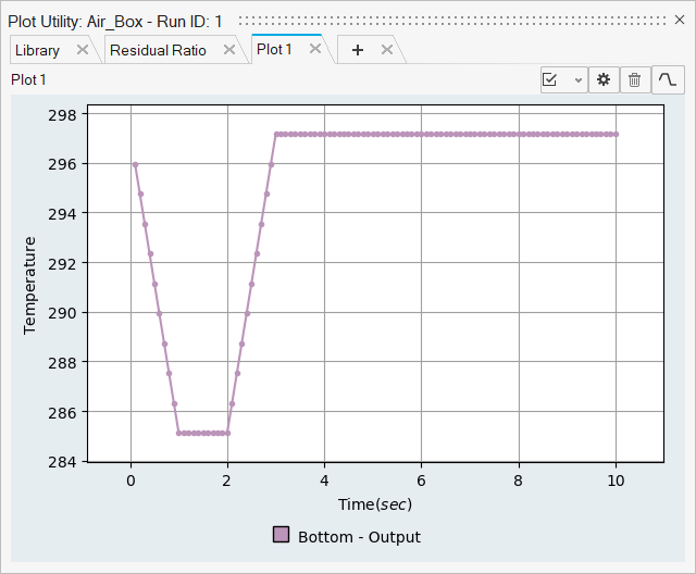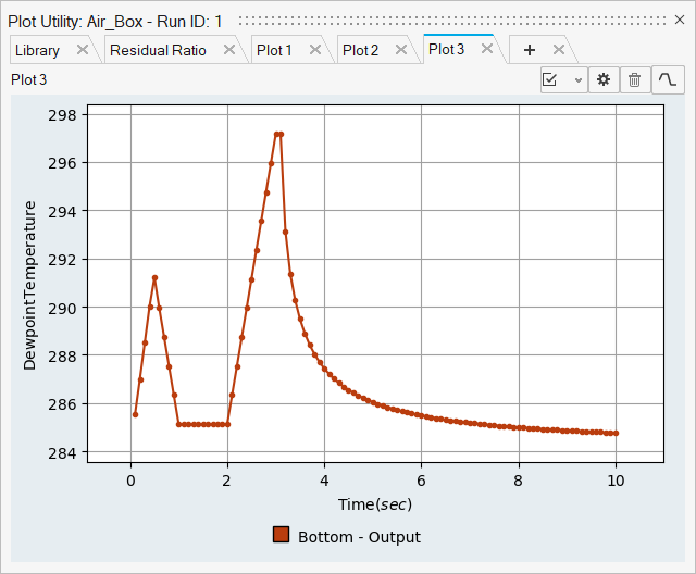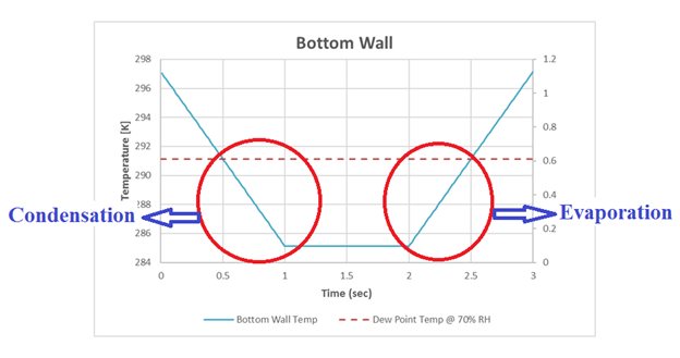 From the above plot, we can see that the Air volume initial temperature is set to 297.15 K. The Bottom Wall temperature drops to 285.13 K over 1 sec, maintains 285.13 K for 1 sec, and then rises back to 297.15 K over 1 sec. The dew point temperature of the air at 70% RH is 291.14 K and is reached at 0.5 and 2.5 sec. On the whole we can see that both condensation and evaporation occurs when the dew point temperature is reached, as explained above.