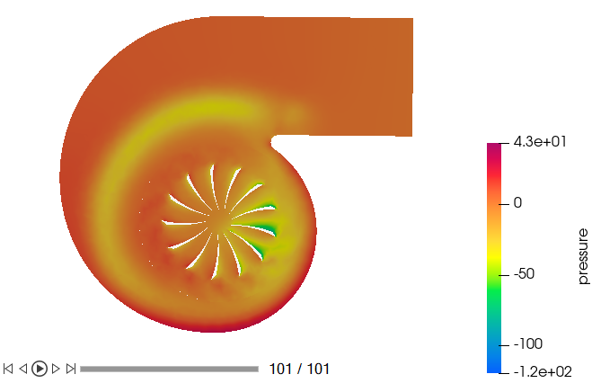 In this tutorial, you worked through a basic workflow to set up a transient simulation with a sliding mesh in a centrifugal blower. You started by importing the mesh; once the case was set up, you generated a solution using AcuSolve. Then, you computed the blower momentum using the Plot tool and created a contour plot for pressure on a cut plane using HyperMesh CFD post.