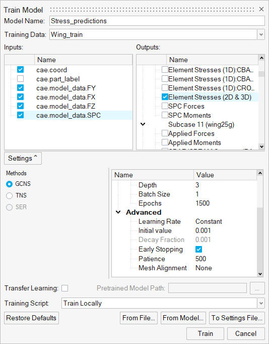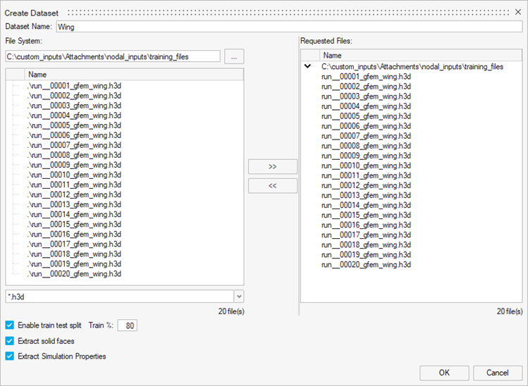 Inside the training_files folder, there are 20 .h3d files named run__0000X_gfem_wing.h3d and 20 .csv files named run__0000X_gfem_wing.csv files. Each .csv file contains a list of nodes and the values of the four custom inputs (applied forces in the X, Y, Z directions and the single point constraints) along with a header row.