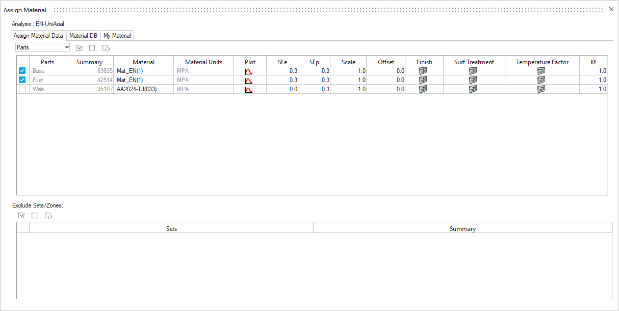 The Material list is populated with the materials selected from Material Database and My Material. A list of verified materials available in the database for EN calculation can be found at MATDAT and efatigue.com.