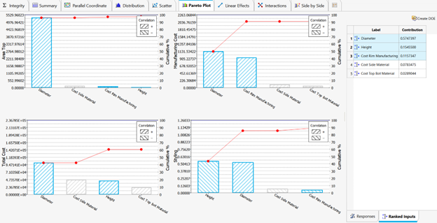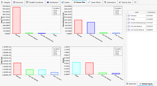 In the Pareto Plot shown in Figure 1, only the top four factors are displayed. As a result, the Diameter, Height, Cost Rim Manufacturing, Cost Side Material, and Cost Top Bot Material variables are relevant.