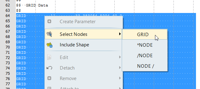 - Select all of the GRID, *NODE, or /NODE cards by right-clicking anywhere in the text area and selecting from the context menu.