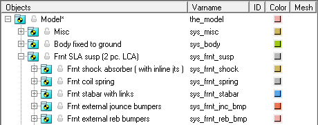 Optional subsystems may add bodies to the suspension, for example the shock absorber adds two bodies: a shock rod and shock tube.
