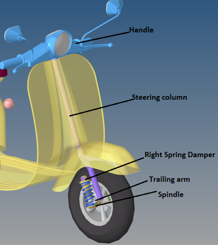 of the steering column. The inline spring damper system is mounted on the trailing arm on