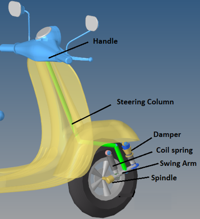 Spring and dampers are mounted between the trailing arm and the steering column with a fore