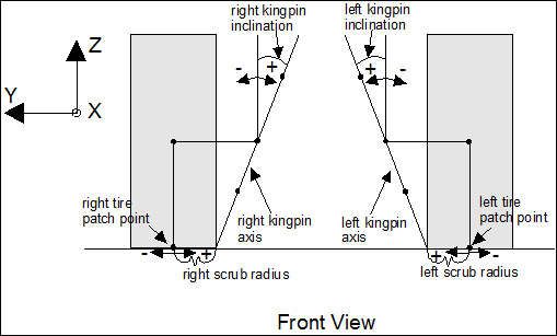 | F2 | RESULT(2) | Left Scrub Radius | mm | The magnitude is the global lateral distance between the left tire patch point and the left kingpin ground intersection point. The sign is positive when the kingpin intersection point is inboard of the tire patch point. See Figure 2. |