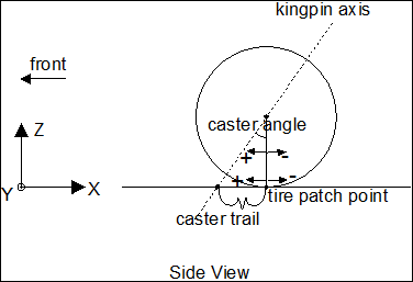 | F6 | RESULT(6) | Left Caster Trail | mm | The magnitude is the global longitudinal (X) distance between the left tire patch point and the left kingpin ground intersection point. The sign is positive when the kingpin intersection point is forward of the tire patch point. See Figure 1. |