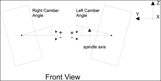 | F6 | RESULT(6) | Left Camber Angle | deg | The magnitude is the global front view angle between the left wheel spindle axis and the global Y (lateral) vector. The sign is positive when the bottom of the tire is inboard of the top of the tire. See Figure 2. |