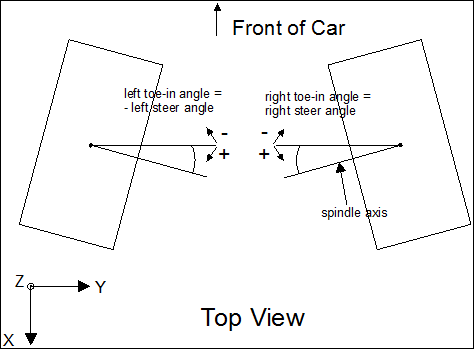 | F2 | RESULT(2) | Left Toe-in Angle | deg | The magnitude is the global top view angle between the left wheel spindle axis and the global Y (lateral) vector. The sign is positive in toe-in and negative in toe-out. Left wheel toe-in angle is equal to the negative of the left wheel steer angle. See Figure 1. |