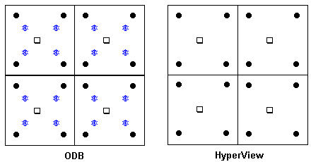 The following diagrams represent the data locations for first-order elements in the ODB file and in HyperView: