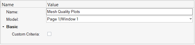Right-click at the Report or Chapter level and select .- Below are the properties associated with the Mesh Quality Plots module.