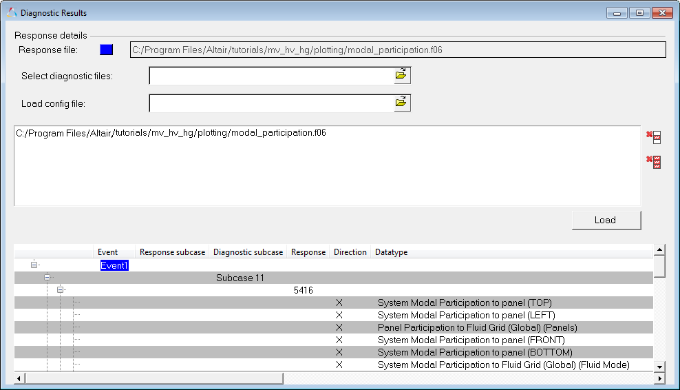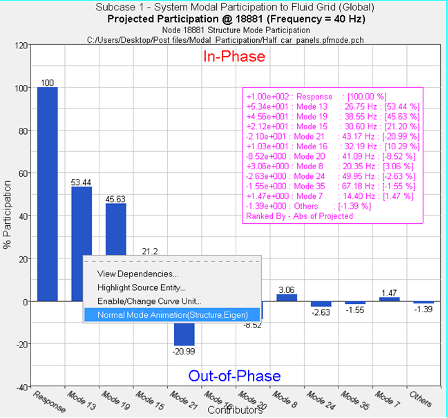 Normal modes data can be associated to modal participation results using the Diagnostic Results option on the context sensitive menu of the response plot. Select and load a normal modes data file from the Diagnostic Results dialog and click OK once the data in the file is loaded. A dynamic context sensitive menu item Normal Mode Animation is available from the modal participation bar plot, which when selected, generates a normal modes animation plot.