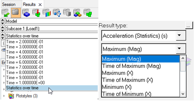 The acceleration statistics can be viewed in HyperView after loading the H3D file, under Statistics over time option at the end of the timestep list in the Results Browser. Then, various statistics can be chosen from the sub-menu under Acceleration (Statistics) (s).Figure 1.