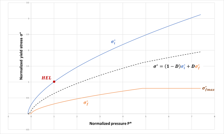 This allows a smoother transition between and during damage.Figure 2. Evolution of Normalized Yield Stress with Respect to Normalized Pressure. Damage value of D = 0.5.