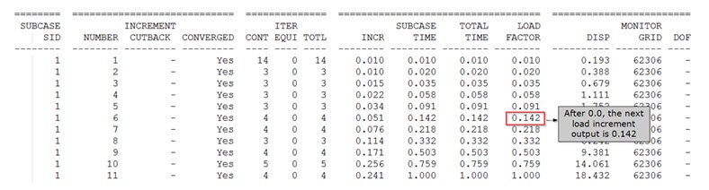 SET,10,TIME ,0.0,THRU,1.0,by,0.1 ,1.0,THRU,2.0,BY,0.2 - If NLOUT is specified, then for a particular nonlinear subcase, the first and last load increments are always output regardless of the option used (NINT, FREQ, TIME). Additionally, for the FREQ option, the second load increment is also always output in addition to the first and last load increments. Counting for the FREQ option commences from the second load increment.
