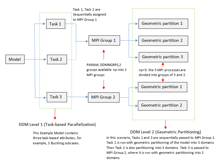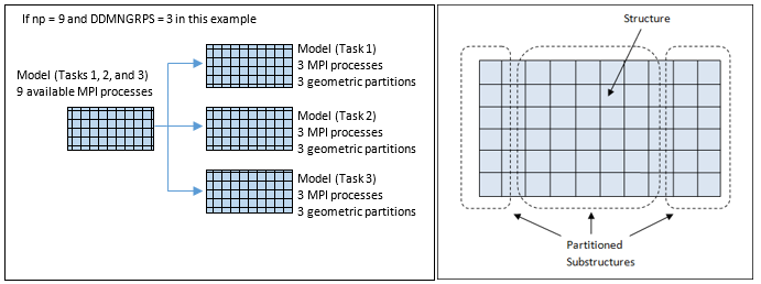 The DDM functionality for level two parallelization is direct geometric partitioning of a model based on the number of MPI processes available in the MPI group that is assigned to this task.
