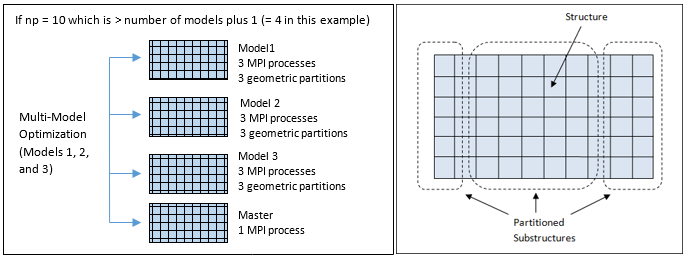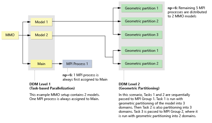 npfor each model is explicitly defined in the main file). DDM Level 1 for MMO simply distributes the extra MPI processes to models evenly. DDM Level 2 parallelization is geometric partitioning of each model based on the number of MPI processes assigned to each one. For more information, refer to Multi-Model Optimization.