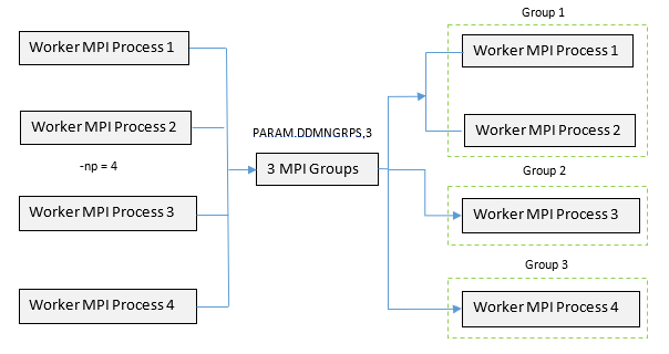 support geometric partitioning level 2 DDM).- In the case of Global Search Option, the MPI process groups should not be confused with the number of groups (NGROUP) on the DGLOBAL entry. They are completely different entities and do not relate to one another.