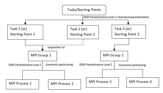 Each task/starting point is then solved sequentially by an MPI group. Each MPI group