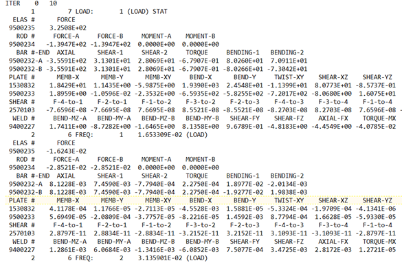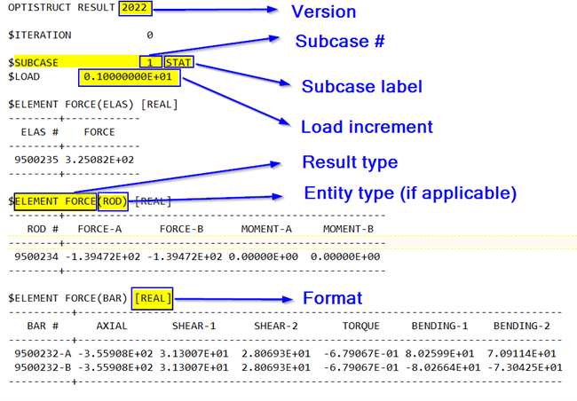 Result Type Analysis Types DISPLACEMENT Linear Static, Normal modes, Linear buckling analysis. DISPLACEMENT Frequency response analysis (Direct and Modal) in REAL/IMAG or MAG/PHASE formats. VELOCITY ACCELERATION SPCFORCE Linear Static, Frequency response analysis (Direct and Modal) *. MPCFORCE - Element based results: