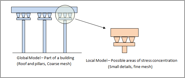 In Figure 1, an example building is illustrated wherein sections containing the pillar-roof joint are modeled as separate submodels with a refined mesh. The finer mesh allows for better accuracy at regions with high stress concentrations. Using the Global-Local Analysis capability, the results from the coarser global model are interpolated and applied to the finer mesh of the local model at the cut surface. This allows for the local model to be driven by the results of the global model.