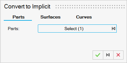- Parts: Allows selection of multiple nonimplicit parts. Each selected part will be converted to an implicit version of the part.