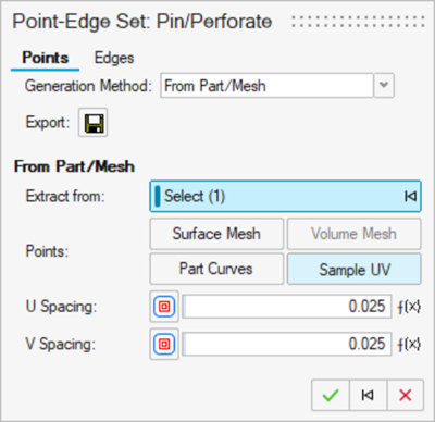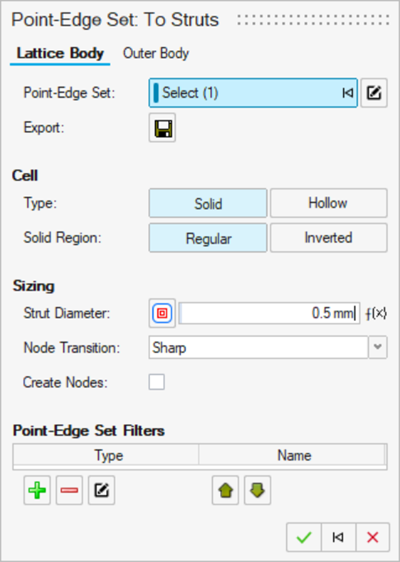 sampling) of the body. For triangle or quad mesh bodies (surface meshes), points can be extracted based on the vertices of the mesh. For tetrahedral or hexahedral volume meshes, points can be extracted based on the vertices of the mesh. For bodies that are already cell strut lattices (via implicit modeling), the nodal positions of the underlying unit cells of that lattice can be extracted into a point-edge set. If an implicit modeling point cloud object has been created, these points can be extracted into a point-edge set. |