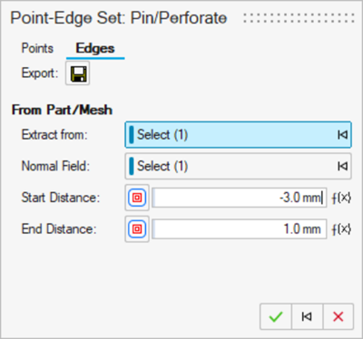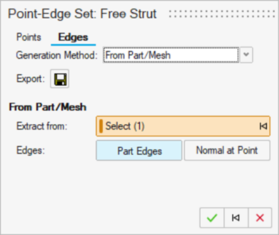 sampling) of the body. For triangle or quad mesh bodies (surface meshes), edges can be extracted based on the edges of the mesh. For tetrahedral or hexahedral volume meshes, edges can be extracted based on the edges of the mesh. Based on some initial points in a point-edge set, edges can be created based on each point and a vector. The vectors are derived from an implicit body (field) whose gradient supplies normal vectors (computed as the gradient of a scalar field). The points and the normal vectors define an infinite line, so you can specify the start and end locations of the edge along this line using the Start Distance and End Distance values (measured from the initial points, in the direction of the normal vector). Once complete, this will define the final set of points and edges in the point-edge set. For bodies that are already cell strut lattices (via implicit modeling), the edges in underlying unit cells of that lattice can be extracted into a point-edge set. |