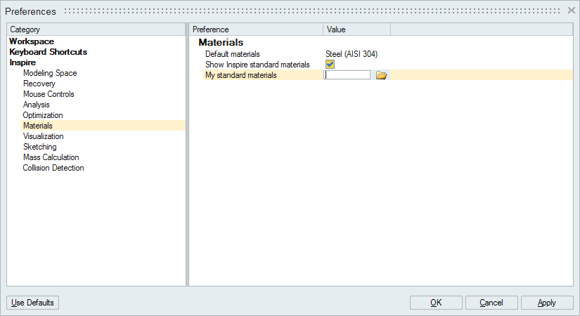 4. To change the default library, click on the value for My standard materials and browse to the location of the database.