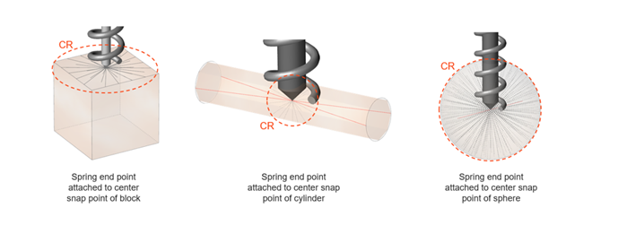 The Connection Radius (CR) is automatically calculated when entities such as springs, motors, and actuators are first created. Initially, it is directly associated with the entity graphic sizing that you can adjust if you double-click the motor or actuator and drag the handle. For example, the initial CR value of a motor is equal to the motor shaft's radius, and the initial CR value of a spring-damper is equal to half the spring's diameter. If the CR is overridden automatically by the simulation or by the user, the CR value will no longer be associated with the graphic size.