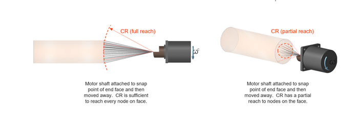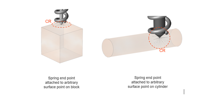 When modeling with flexible bodies, certain entities such as springs, motors, and actuators must be sufficiently attached to the flex body to transmit forces. The Connection Radius (CR) parameter associated with these entities is the minimum (spherical) reach-out radius that originates from one of the entity's definition points. The purpose of the CR is to ensure that the entity can reach nodes on the flex body for sufficient attachment. In finite element terminology, the actual connection used between the entity and flex body is RBE2.
