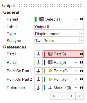 Table 2. Subtype Description Two Points The output can be measured between two points that belong to two different bodies. Entity The output can be defined for an entity. The supported entities for this method of output are: body, joint, beam, bushing, field, force, spring damper, and contact. Entity Set The output can be defined for all entities of a certain type that are currently present in the model. The supported entities for this method of output are: body, joint, beam, bushing, field, force, spring damper, and contact. - Resolve the References collectors as per available choices. To edit the References, follow steps in the Edit an Output section.