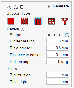 - Enter 1.5 mm for the Pin separation to define the spacing of the supports.