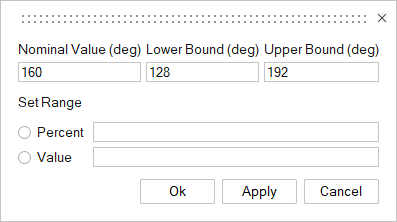 - Set Range: Set the range between the minimum and maximum values based on a Percent or Value difference above and below the nominal value for a Continuous Variable. By default, the range is +/- 10% of the nominal value.