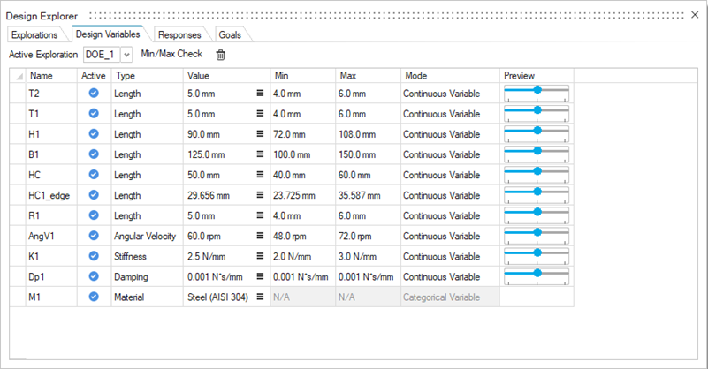 Geometric variables may be sketch dimensions, lengths, angles, or push/pulls. These constraints are minimum and maximum values for the defined geometric variables. Properties and boundary condition variables such as material, forces, torques and pressure are also supported. These constraints are specified in the Design Variable tab and the variable's value will vary within the exploration.